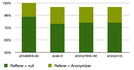 Im Diagramm auf der rechten Seite ist die ermittelte Anonymisierungsrate (in Prozent) dargestellt. Die Balken setzen sich zusammen aus den vollständig anonymen Aufrufen (Referer ist leer) und den Aufrufen, bei denen der ursprüngliche Referer durch die anonymisierte URL überschrieben wurde. Die Unterschiede im Aufrufsverhalten beruhen in der Unterschiedlichen Behandlung der Weiterleitungen in verschiedenen Browsern.